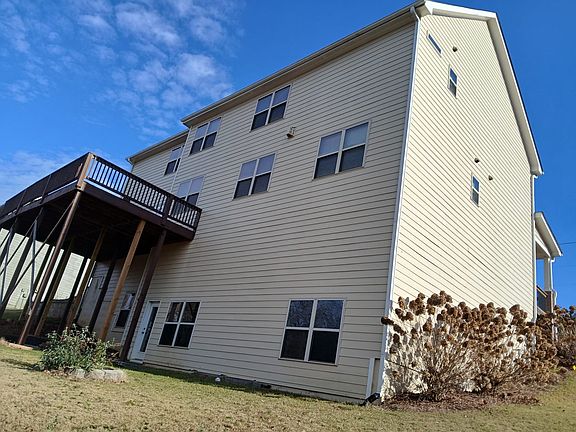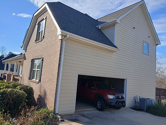 Enjoy easy living just minutes from Lake Lanier's launch point, offering quick access lakeside recreation and located less than 10 miles from North Georgia Premium Outlets for convenient shopping and dining. A wide concrete walkway leads to an elevated, covered front porch with classic white columns and wooden railings, perfect for unwinding after a day out. The driveway is positioned to the right and leads to a side-entry garage.