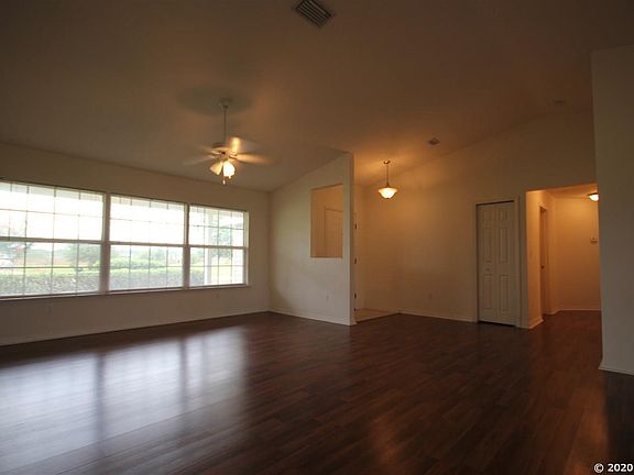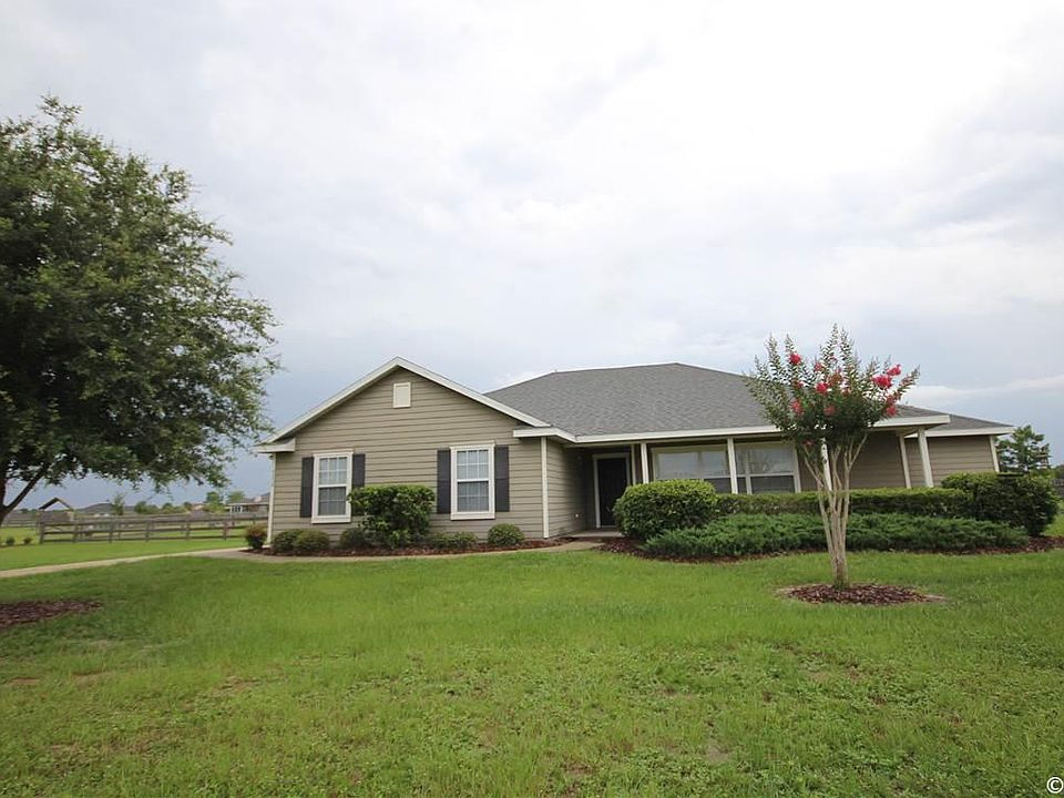 Beautiful 3/2 home with 2 car garage situated on a 1 acre fenced lot! Laminate wood floors through the home and ceramic tile in the kitchen and bathrooms. Covered patio with a paddle fan. Master suite comes with garden tub and separate shower, recessed ceiling with ceiling fan in master bedroom, and a spacious walk in closet. W/D included and lawn service is provided. Pets are welcome! 125 Processing Fee