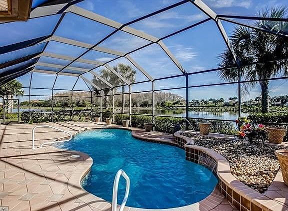Move in Ready! Windjammer model on premium lot with captivating views across a wide lake to elevated 13th green, rock wall & preserve beyond. Original owners are offering their beautiful lightly used & meticulously maintained home. Upgrades throughout including ANDERSON IMPACT WINDOWS AND DOORS. Gourmet kitchen provides Kitchen Aid stainless appliances, custom cabinetry, granite countertops. Spacious master suite and en-suite bathroom with luxurious soaking tub, walk-in shower & dual sinks. Expanded lanai with free-form salt-water pool, auto-fill, two deck jets & waterfall feature, & two in-ground planting areas with irrigation, POOL BATH! 6 FT GARAGE EXTENSION, workshop area and 20 amp outlet for power tools! Italian porcelain tile in the living areas and den, tray ceilings with crown molding, 8' doors, custom baseboards, window casements & sills, additional recessed lighting throughout. Lennox 14 seer A/C was installed in 2013. Make this your home in our Elegant Paradise with all the impeccable amenities The Quarry offers with LOW FEES including Resort pool/spa with Outdoor Grill and Bar, clubhouse dining, fitness, lap pool, tennis/tennis pro, bocce, pickle ball, and more!
