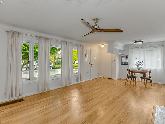 This charming mid-century home is move-in ready. The spacious living room has beautiful hardwood floors that flow through the hallway and bedrooms. The bathrooms are updated. Remodeled kitchen has beautiful cabinets, solid surface countertops, tile floors and has an eating area. Spacious basement with lots of storage, laundry facility, family room, full bathroom, a bonus room and a possible 4th bedroom (non-conforming/no egress). The detached 2-car garage is a dream for those who like to do hobbies and work on projects. It has drywall, roxul insulation, acoustic Z channels, reflective sheathing, 120&240 powered and airconditioning. Spacious backyard waiting for your summer outdoor gatherings. Other improvements include: replaced sewer line to the street in 2022, New Electric panel and upgrade to 200amp in 2022, New furnace and airconditioner in 2019, all internal plumbing supply lines were replaced with PEX in 2017. [Home Energy Score = 3. HES Report at https://rpt.greenbuildingregistry.com/hes/OR10228441]