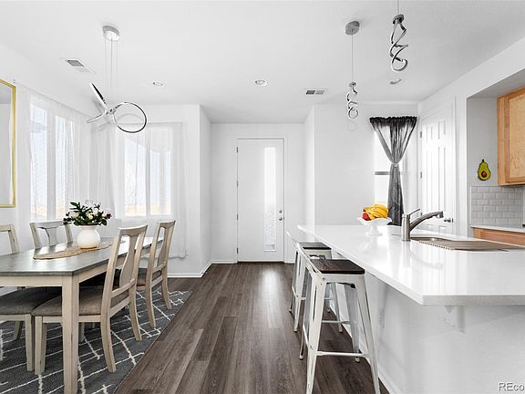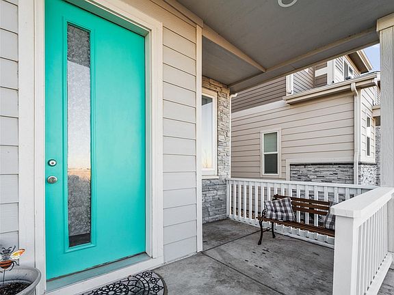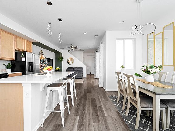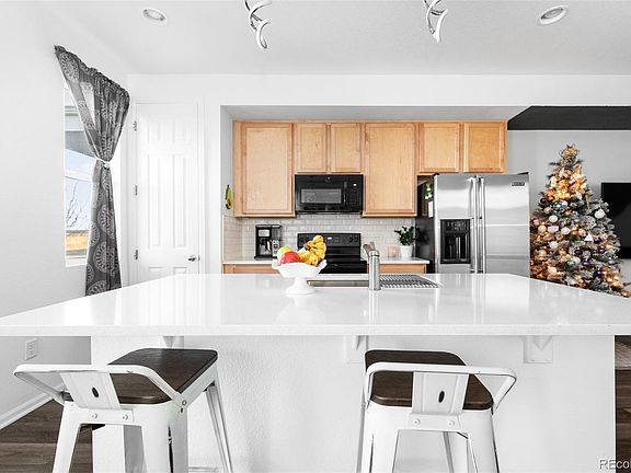 Contemporary style flourishes in this Prairie Farm townhome. Built in 2020, this residence presents the perfect combination of functionality and sophistication for low-maintenance living. A covered front porch welcomes residents into an open and airy layout wrapped in a neutral color palette. Boasting quartz countertops and a vast center island, the kitchen opens into a dining area offering plenty of room for entertaining. Sliding glass doors in a spacious living area open to reveal access to a private outdoor patio w/ ample space for seating. Retreat to the upper level to discover a bright primary suite featuring a walk-in closet and a serene bath. Two additional bedrooms with large windows present possibilities for a home office or guest accommodation. Ample storage for keeping outdoor recreation equipment is found in an attached two-car garage. Residents enjoy the convenience of this desirable location w/ easy access to DIA and Second Creek Open Space. Buyer must qualify to assume Solar loan. Balance approximately 22,347; monthly payment 120.00.