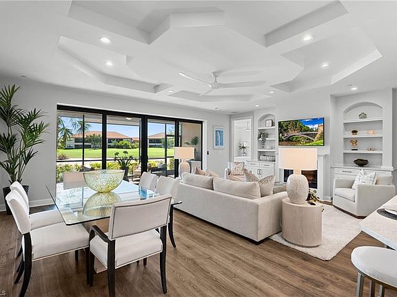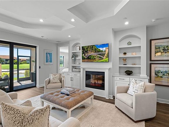 LIVE A VACATION LIFESTYLE IN ESPLANADE! FULL GOLF MEMBERSHIP INCLUDED! This spacious and luxurious 2 bedroom, 2 full bath, 1 car attached garage coach home lives big with an open great room style floorplan and a 16' pocket sliding glass door to a 23'x10' covered & screened lanai overlooking a tranquil lake and 15th fairway. Enjoy daily sunset views with this coach home’s west facing rear exposure! Fine appointments include: luxury laminate flooring throughout (no carpet anywhere); Level V shaker style cabinets with quartz countertops in the Kitchen; GE stainless steel appliances; Great Room feature wall with built-in cabinets, floating shelves, and LED fireplace; HURRICANE IMPACT RATED WINDOWS/DOORS; coffered style tray ceiling; upgraded lights & fans; freshly painted interior; and more! Just 50' away from one of the two Montelanico pools! Esplanade Golf & Country Club of North Naples offers a true “Lifestyle Community” with world-class amenities, including a resort pool with cabanas and the popular “Bahama Bar,” tennis, pickleball, bocce, a 14-mile network of bike/walking trails, and an 18-hole private golf course. The impressive 15,000 Sq Ft clubhouse features a restaurant, bar, wine-tasting room, wine lockers, and a Starbucks-style café. Best of all, the property’s water/sewer usage, building insurance, building maintenance, landscaping, irrigation, golf membership, and all community amenities are covered under a quarterly fee of just $4,449—no additional fees or memberships required! Don't miss your opportunity to own this exceptional home in one of Naples’ most sought-after communities. Schedule your tour of this stunning property and Esplanade Golf & Country Club today!