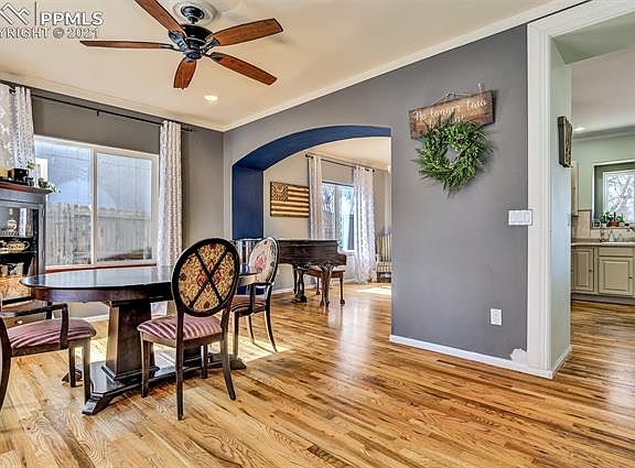 WELCOME HOME to this beautiful 4 bed, 3 bath, 2,296 square foot home. This open concept 2-story has many great features such as: a covered front porch, hardwood flooring, stainless steel appliances, kitchen pantry, gas fireplace, recessed lighting, six panel doors, ceiling fans, mountain views, a large 5-piece master bathroom, custom crown moulding on the main level and in the master bedroom, a front storm door, and a fully fenced backyard with a small fish pond and a fire pit for your enjoyment. When you walk in the front door you will immediately notice the high ceilings and large formal dining and living rooms. The kitchen has an island and is wide open into the spacious family room. A large half bath and storage closet complete the main level. Upstairs you'll find a large master suite with walk in closet and attached bathroom (with jetted tub). The laundry room, three more bedrooms, as well as a full bathroom complete the 2nd floor. This home is close to shopping and restaurants and has easy access to I25 and the Powers corridor. Schedule your showing today! Thank you for showing.