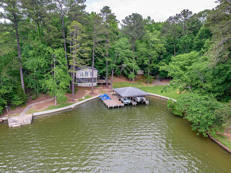 Charming Lake Sinclair getaway! This private 4BR/1.5BA home is nestled on deep water with panoramic main lake views. Summertime is all about enjoying the outside and this home has you covered. The double boathouse has two boat slips with electric lifts and there are 2 electric jet ski lifts. The yard has a large level area perfect for games and activities. The best seat in the house is the spacious screened back porch with attached open deck with additional seating and loads of room for grilling and entertaining. The interior is well-maintained with an open kitchen and living room space. Upstairs the master has expansive lake views. Three additional bedrooms complete the second level along with a full bathroom. The home also hosts a large storage shed for your lake toys and tools. This home is sure to be the background for fun memories for years to come!