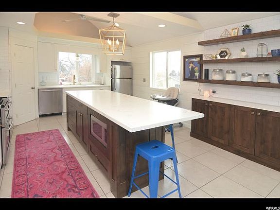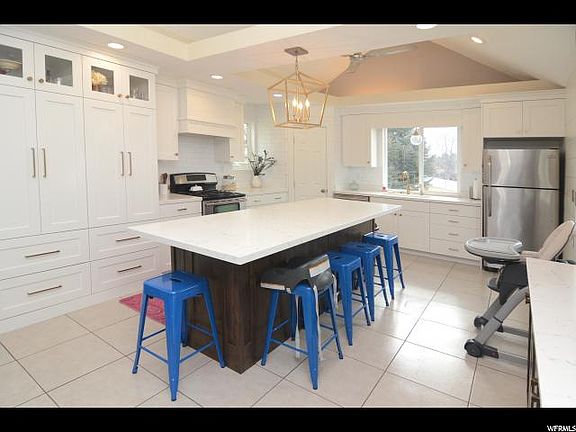 Renovated, super clean home in a fantastic location in east Kaysville! This large kitchen is STUNNING, with all new custom wood cabinetry (with soft-close), tons of storage, shiplap and subway tile walls, quartz countertops, huge island bar, stainless steel appliances, pantry, tile flooring, vaulted ceiling, canned lights, and great natural light! Shiplap walls throughout many parts of the house, adding to its modern appeal. Master bathroom with tile shower with multiple heads. Attractive wood laminate flooring throughout much of the main level and in family room downstairs. New windows in the basement, and newer windows on main level. Fireplace in downstairs family room with built-in lockers/storage. Walk-out basement. Large driveway offering lots of parking space, plus RV parking. Newer membrane roof over the garage (still under warranty). Terrific views to the west! Low-maintenance yard with mature trees and pines, and brand new sprinkler system. Reverse osmosis water system, and newer water softener. All new exterior doors; newer windows upstairs; newer hardiboard siding. Less than 1 block from the elementary school, and walking distance to Davis High, and Kaysville Jr. Also conveniently located near Davis Golf Course, Nicholls Park, Highway 89, and access to I-15.