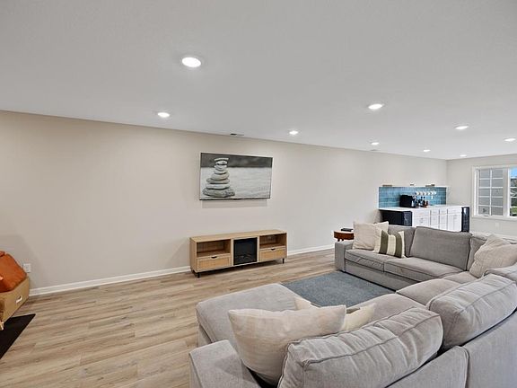 The finished walkout lower level offers a 4th bedroom plus plenty of space for entertaining. Highlights include a wet bar with two beverage refrigerators, solid surface countertops, tile backsplash, and floating shelves, along with a free-standing sauna that stays with the home. A large storage room with glass French doors provides flexible space—ideal for a workout room or hobby space.