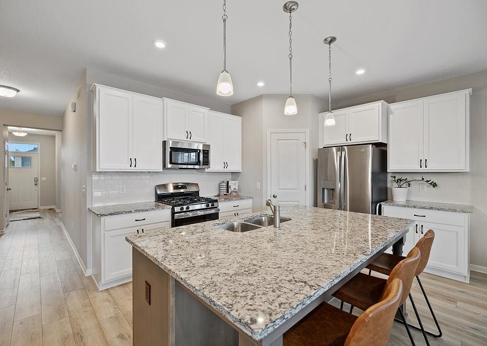 No snow/No mow, turn-key living! This home has been pre-inspected and thoughtfully upgraded inside and out. The main level features three bedrooms, a cozy gas fireplace, and luxury vinyl plank flooring throughout. The kitchen and living spaces flow to a maintenance-free deck with iron railings, overlooking a backyard putting green and an irrigation system that keeps everything low-maintenance.