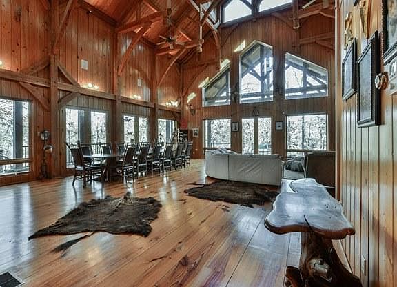 Timber Frame Lodge on 12.5 Secluded Acres with Private 2 Stall Dock. 48x80 9 car detached heated garage with 1/2 bath. Almost 5,600 sf Lodge, 5 bed, 5 bath, grand hall great room with 36' tall ceiling, 14 person dining area. Hand tooled cypress logs built by Amish artisan Daniel Schwartz (built Arnie's Barn at Top of the Rock), 2 master suites, one with private hot tub & wet bar, deck & tons of windows, steam shower, distiller, Crestron home sound system, Lutron lighting. Huge decks for entertaining. 5 minutes to Branson West & 15 minutes to airport. Easy access to dock right behind the house.