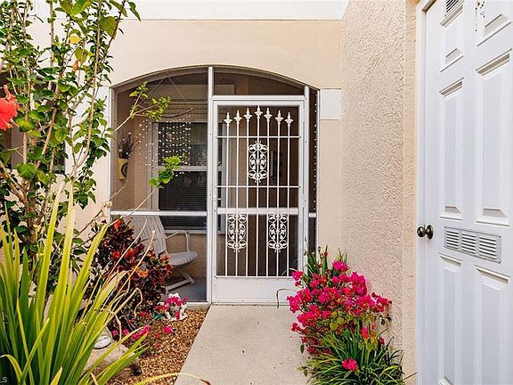 First floor, 2 bedroom plus den, 2 bath carriage home affords both lake and golf course views from the private, screened lanai. This unit features private, courtyard with screened entry, laminate flooring in all main living areas, neutral Berber carpeting in bedrooms & den, crown molding, custom mirrors in dining area, chandelier and ceiling fans, window treatments & blinds along with a tiled lanai. Eat-in kitchen is equipped with wood paneled cabinets, pass through to dining area, solid surface countertops, pantry and newer appliances. Master Suite features lanai access, large walk-in closet, dual sinks & glass enclosed walk-in shower. Additional amenities includes guest bedroom & bath with walk-in shower, laundry room with washer, dryer, laundry tub, large storage room, storm shutters, alarm system & one car detached garage.