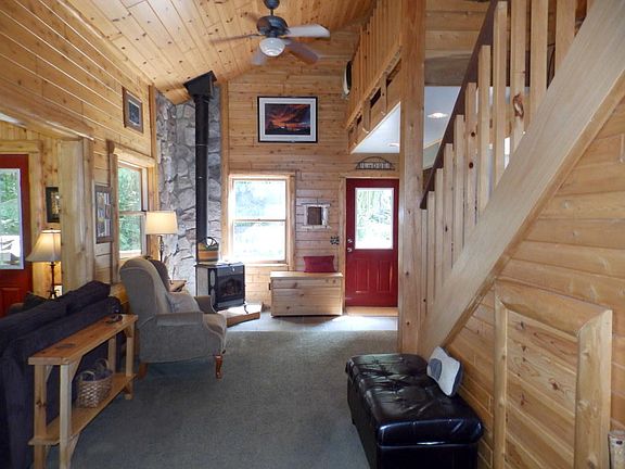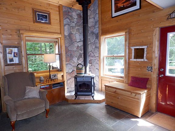 Custom home in a secluded setting on 10 acres. Free standing wood fireplace with stone backing. Tongue and groove throughout. Peaceful setting on well maintained private road. Wildlife abounds in a relaxed woodland atmosphere. Perfect for those that want to get away but still be near town or for hitting the nearby snowmobile trails