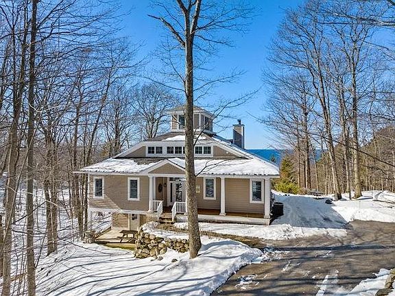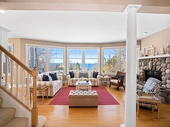 Enjoy incredible Lake Michigan views and 4 private acres from this impeccably maintained home on Lake Shore Drive. The main level offers a living area with picture windows overlooking the lawn and lake, natural stone fireplace, wood floors, den and a guest suite with access to a screened in porch. The second level leads to a primary suite with panoramic water views and loft that can serve as a study. Spiral stairs take you to a third level widow's peak perfect for relaxing and looking over the lake. The lower level has a second living area, full bath, cedar storage closet and large mudroom/laundry area with its own entrance. The main floor den or lower level living area could be easily converted to additional bedrooms. With tasteful furnishings included, a two car garage, beautiful lawn, paved drive overlooking a wooded ravine and the Good Hart beach just minutes away, this is a perfect year round or vacation home.