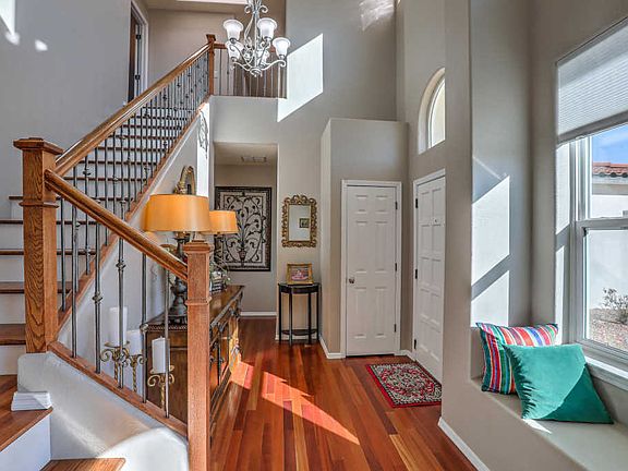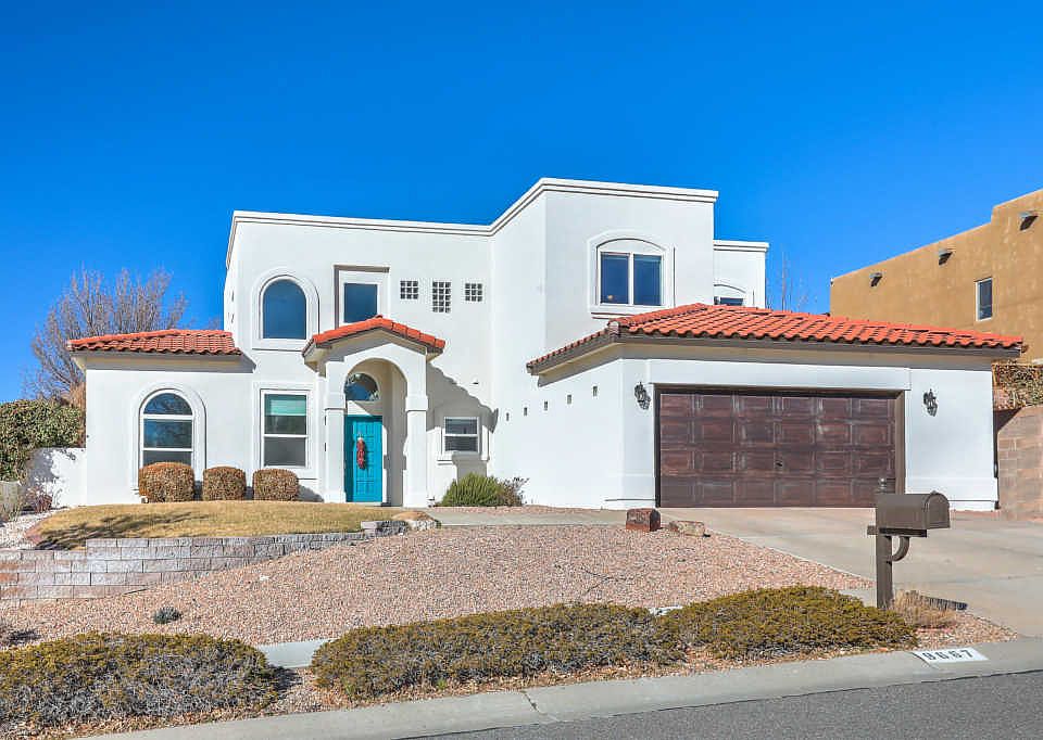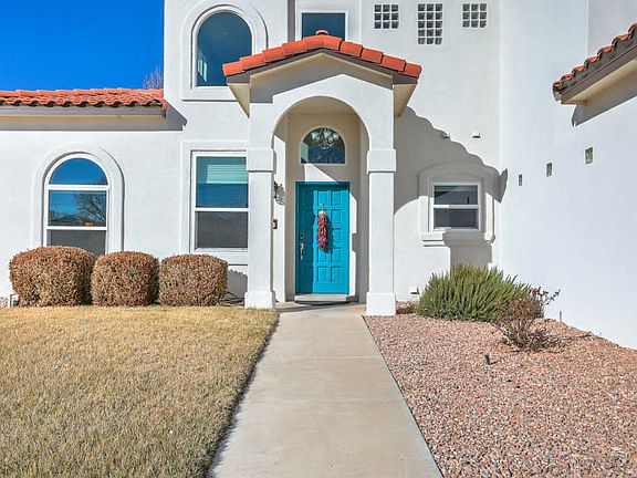 This gorgeous home is tucked in a cul-de-sac and has several updates such as a newer TPO roof, windows, stucco, flooring, fixtures, and blinds. It's a 4 bedroom, 3 bath in the La Cueva school district. You'll enjoy the refrigerated air and cozy floor plan. The kitchen has stainless steel appliances with a gas hook up if desired, a center island and open concept to the living area. There is also a formal living area that could be a formal dining room if desired. The spacious master bedroom has a gas fireplace, a large bathroom with separate shower and tub, double sinks, 2 walk in closets, and a balcony with great views of the Sandias. The backyard has an inviting patio area and a beautiful heated gunite swimming pool with a diving board!