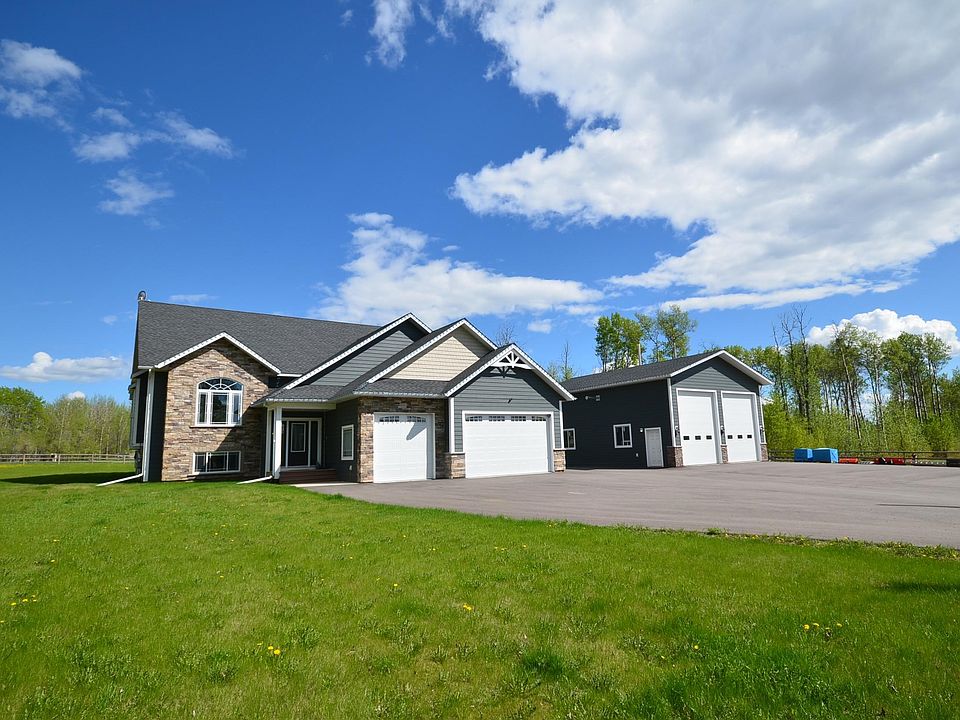 Your new home is calling, just 2 minutes from town on 4 gorgeous acres. Over 3100 sqft featuring high end finishing touches, 9' walls & vaulted ceilings, open concept living space with lots of big windows, gas fireplace and covered sundeck off dining area. Gorgeous kitchen plans with a 60 sq ft walk in pantry, large island and high end cabinets with granite counters. 3 large bedrooms up and 2 full baths including en-suite with large luxurious 2 person tiled separate shower and dual sinks. Fully finished basement with huge rec room and 2 additional bedrooms. 3 car attached garage and double detached heated shop measures 28x38. Fencing/corral is the perfect set up for a small hobby farm.