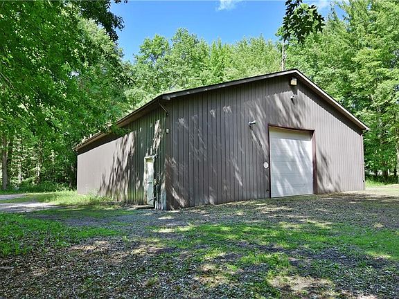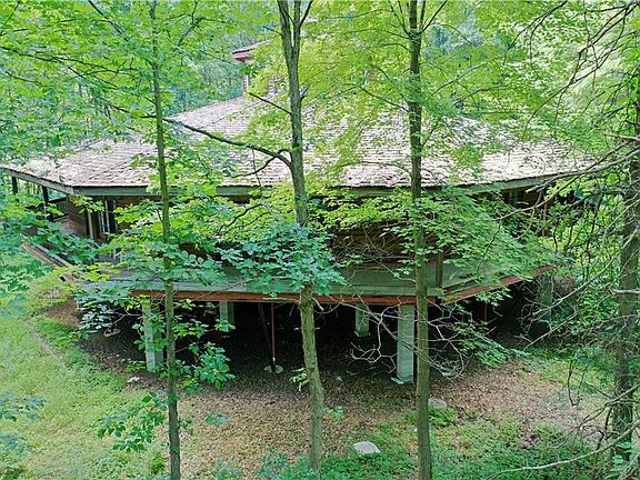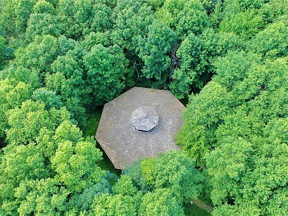 Beautifully elusive shielded in natural privacy one-of-a-kind treetop getaway is not finished just waiting for you to unleash its full potential. A tree lined property and architectural delight is a unique raised octagon open central second floor layout that brings in natural lighted scenic views from 8 angles. An engineering marvel designed I-beam supported structure with a block sub layer designed to be lower garage space with three entries at basement level. The main floor showcases tall pillars designed to wrap an exposed central fireplace with a chimney extending next to a spiral staircase that passes through the third-floor loft and natural lookout. Redwood doors have with stood the test of time. The deck space provides a wraparound patio. Framework shows three bedrooms with massive master suite with bath and closets. Adjacently a 48' x 60' garage serves as finished shop space complete with a kitchenette, bath, 150 amp service,radiant propane heat, front and back insulated 12' x 12' overhead doors and loft storage. 7.6 acres with under ground electrical service with transformer. Has a septic that will need upgraded and a well which now services the garage. The original home builder was unable to finish his dream home which may make this an opportunity to have the most unique and quality built home in the area on a beautifully wooded piece of property. Bring your vision and ideas we have the original blue prints. The quality of what was already done is impeccable.