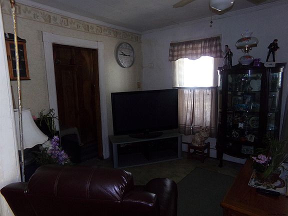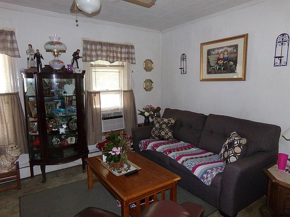 Solid 2-family home. Separate utilities. Owner apt 1st floor: LR, DR with tin ceiling, eat-in K with stove and newer refrigerator, 2 small bedrooms, updated bath with stand-up shower, open front porch, enclosed back porch, hardwood floors under all existing flooring. Vacant 2nd floor apt: LR, DR, eat-in K with stove and refrigerator, 2 small bedrooms, small full bath, hardwood floors, enclosed back porch. New carpet and paneling in hallway leading upstairs. Slate roof, age unk. Full attic. Updated circuit breaker box. Newer hot water tank for 1st floor. Both furnaces updated within last 10 years. Dry basement, stone foundation, dirt and cement floors. Heated 2-car detached garage with loft. Shared driveway - no issues for the past 38 years! Needs some TLC but a solid investment.