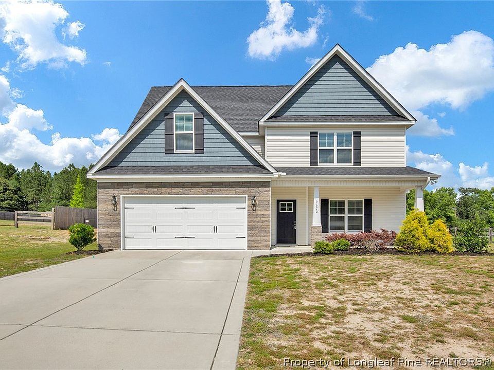 The popular FAWNBROOK plan features a two car garage, covered front porch and back patio, and oversized 1.91 acre lot with fenced in area Home offers four bedrooms, three full bathrooms, and large bonus room. The main level has laminate flooring throughout, a spacious living room with gas log fireplace and living room opens to dining and kitchen area. Kitchen has stainless steel appliances, granite countertops, island, walk in pantry and stylish tile backsplash. Off the kitchen is a large drop zone area, additional storage closet, a full bathroom with tile flooring, and bedroom with a walk in closet. Upstairs features 2 guest rooms, laundry room, large bonus room, and primary bedroom with walk in closet and ensuite bathroom featuring separate shower and soaker tub. The large lot extends both behind and in front of the house.