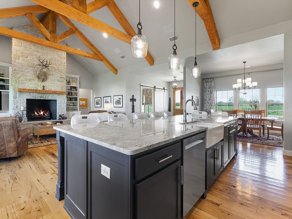 Country living at its finest - but close to the city if you want it! This meticulous cared for ranch is looking for new owners to make their own memories! Nice open floor plan with cathedral beamed ceilings in the kitchen and family room and a wall of windows overlooking your back yard and pastures! Kitchen island will sit 7 people, 5-burner gas cooktop, pot filler, double ovens, beverage cooler, walk in pantry with appliance storage area! Study just off entry with barn sliding door. Entertaining is easy with the dining just off kitchen and open to family room! Split bedroom floor plan with ensuite baths for each bedroom! Upstairs there is a large game room with a full bath that could also be used as a 4th bedroom or guest area! Custom 4 stall barn with wash area, tack room, feed and hay storage. 4 pastures for turn out. Stocked pond that is over 1 acre! Shop is 30' x 50' with 15' overhangs great for parking trailers, boats or RV! Spray foam insulation in attic and barns!!