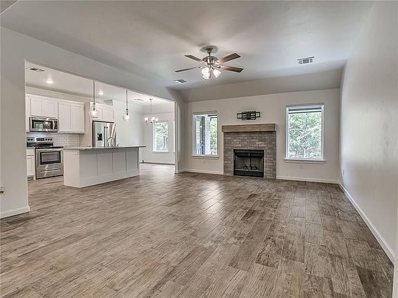 NEW PRICE! Better than New 3 bed, 2 1/2 bath home + Study on a beautiful .79 acre lot with plenty of trees and scenic views in highly sought after Rustic Creek. From the moment you walk in, you'll love the wood tile in main living areas and wood burning fireplace w/ mantel. Cooking in the spacious kitchen is a pure joy and you'll appreciate the many upgrades including an open island, granite counters, stainless steel appliances, deco pendant lighting, tile backsplash, walk in pantry and custom cabinets. The primary retreat is so pleasant and roomy with dual vanities and ample counter space, soaking tub and custom tiled shower. You'll love spending time outdoors on the huge back patio overlooking your private oasis - perfect for entertaining family and friends. Other features/upgrades include well, septic, 3 car garage with door openers, sprinkler system, and lovely designer shades. This one is better than new and includes Upgrades Galore!