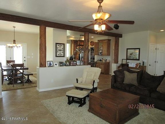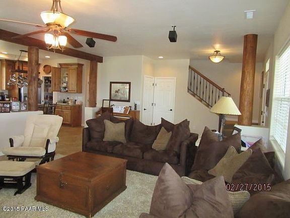 Views, Views from inside and outside on the wrap around covered porch. Here is the home you have been looking for, all the custom features you could ask for, fully fenced 4 acre parcel with riding (horse or Quad) in the Prescott National Forest. 2 master bedrooms, garden tub, snail shower, dual sinks, dressing table. den or office, grand fire place, great open floor plan, kitchen island, granite counters, large pantry mountain views out the kitchen window. from this home you can be in the pines just minutes up the road. Come see this gorgeous home today.Portable horse corrals and arena not included.