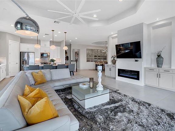 Country club living in a beautiful setting in North Naples! This second-floor end unit provides an open floor plan with a 9-by-6-foot kitchen island. The living room has zero-corner sliding glass doors to the lanai, which overlooks a lake! The kitchen and all three baths have lovely quartz countertops and white cabinetry. Hurricane-impact windows and doors, 10-foot ceilings, 8-foot doors, a new, sleek electric fireplace and attached garage are some of highlights of this coach home. A club/sports membership gives you access to all the amenities with the exception of in-season golf. Esplanade has something for everyone: six tennis courts, four bocce ball courts, gym with aerobics room, gated dog park, poolside Bahama Bar, day spa, resort-style pool and a 15,000-square-foot culinary center with restaurant, bar, wine tasting room and wine lockers!