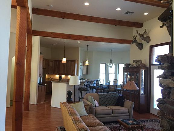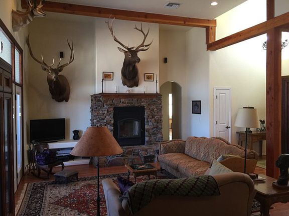 This custom home sits on 2.22 acres and is surrounded by forest service land on 3 sides. You'll enjoy this open floor plan design with high ceilings and exposed timber beams. The fireplace was handcrafted using indigenous stones, and is adequate to heat the living room and master suite. The kitchen has upgraded Jen-Air appliances, tall hickory cabinets, and granite slab counter tops. There is also a wet bar that has a built-in beverage cooler, and a copper sink. Each bedroom has a walk-in closet and 2 of the closets are cedar lined. Outside you'll fall in love again. Whether your enjoying a barbecue on the spacious covered or stargazing on the rooftop deck. This is a must see! Make an appointment today!