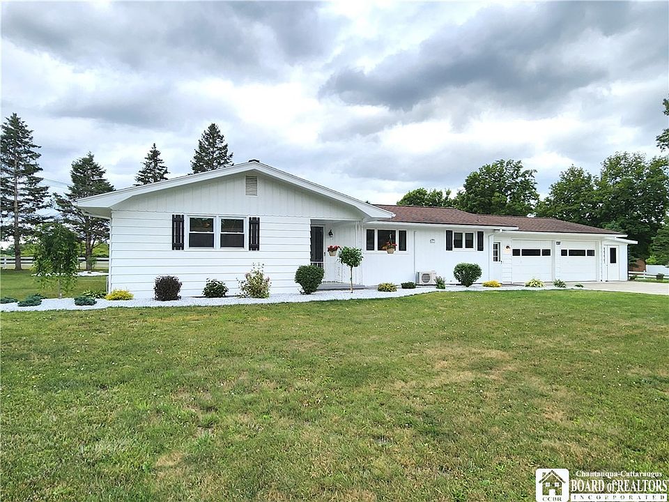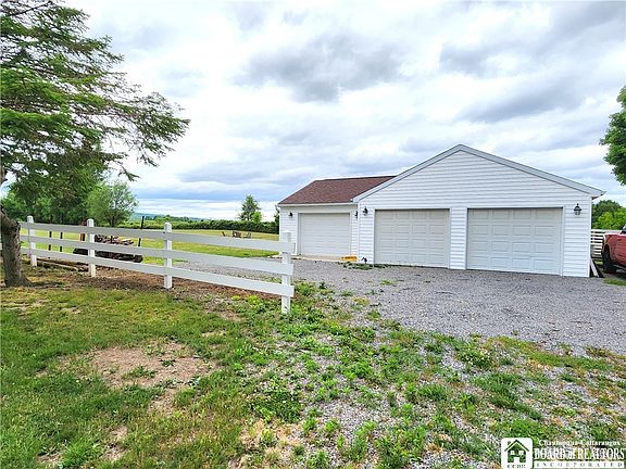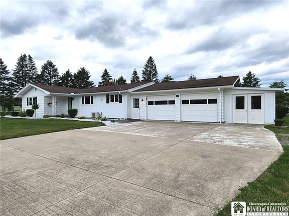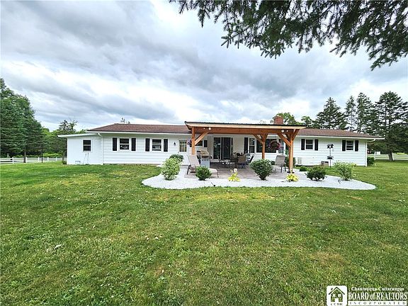 This 3-bedroom/1.5-bath ranch has been meticulously renovated and is located in a beautiful country setting on 1.5 acres yet just minutes away from downtown Fredonia and the NYS Thruway. It features remodeled kitchen with Amish made cherry wood cabinets, granite countertops, backsplash, two lazy Susans, garbage disposal, newer appliances, stainless steel country sink; large living room with fieldstone gas fireplace; full bath with granite countertop and remodeled half-bath; new waterproof laminate flooring throughout; master bedroom with hardwood floor and full wall of closets; Murphy bed in one of the bedrooms; new patio door from dining room to stamped and dyed back patio; newer vinyl windows throughout; two Mitsubishi air conditioners; cedar closet with laundry chute; full basement with 22 x 13 family room, new Dunkirk boiler, Culligan water softening system with reverse osmosis water filter system for drinking water and ice maker, upgraded 200 amp electric panel with circuit breakers; attached 2-car garage and detached 3-car garage/pole barn; enclosed front patio; professionally landscaped; Generac generator. All appliances, window treatments, and safe in basement stay.