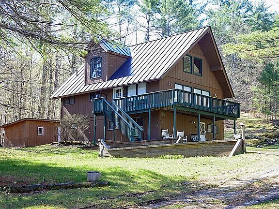 Situated in this country neighborhood, while offering great privacy, along with abutting Blueberry Hill Wildlife Management Area, (which offers 936 acres in Castleton) is this incredible Chalet style home. This spacious home is also only a couple of miles away from the Taconic Mountains Ramble Park making this location a recreational dream come true. The home offers 3 levels of living and is being sold completely furnished with the exception of a few personal items. The layout offers an open floor plan with cathedral ceilings, along with plenty of windows to allow natural light to enter the home. The living room w. brick gas fireplace, dining and kitchen are open to each other making this the perfect spot for entertaining or family gatherings. One of the bedrooms looks down into the living room. There is a large family room w. a second brick gas fireplace that has access to the spacious deck. The home is heated with a Buderus oil boiler and has an inspected oil tank. The exterior offers multiple decks for observing nature and wildlife, shed for storage, and spacious parking area with an easy to navigate driveway. An easy drive to slopes, lakes, airports, and downtown Castleton. A sweet Vermont home.