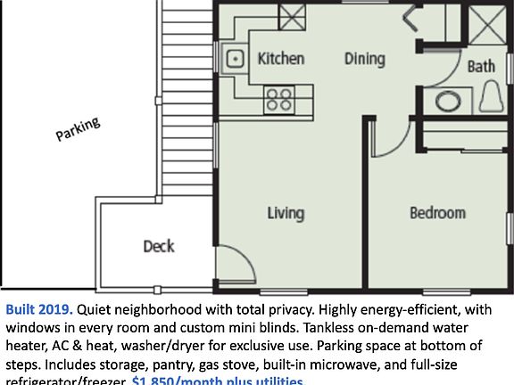 Welcome to Your Retreat in the Heart of West Santa Rosa, Just Minutes from Sebastopol RARELY AVAILABLE This beautiful, private upstairs apartment, nestled in a quiet and modern neighborhood, offers the perfect haven for one person seeking tranquility and convenience. Built in 2019 and soon to be freshly painted, this charming residence features a separate entrance above the garage, ensuring both privacy and ease of access. You'll also enjoy your own dedicated parking space right at the bottom of the steps. Thoughtfully Designed Layout The open living room connects seamlessly to the kitchen and dining area, creating a comfortable and airy space perfect for relaxing or entertaining. The gourmet kitchen is equipped with a full-size gas stove, built-in microwave, and refrigerator/freezer, along with a pantry for extra storage. The bedroom offers a private retreat with ample natural light from custom blinds on every window. The bathroom features a clean, modern design with a shower. Step outside onto your private deck, ideal for enjoying morning coffee or unwinding after a long day. CONVENIENT FEATURES LVP Flooring Throughout Enjoy sleek, easy-to-maintain luxury vinyl plank flooring in every room for a modern, cohesive look. Climate Control Stay comfortable year-round with AC and heat. Laundry Access Full-size washer and dryer for your exclusive use, conveniently located in the garage (garage not included). Dedicated Parking Your own parking space at the bottom of the steps for maximum convenience. UTILITIES & COSTS Electric and gas shared with main home, averaging around $60/month. Tenant pays half of the trash bill (approximately $28/month). Water (separately metered) and internet are tenant's responsibility. Move-In Details--Available September 5 Lease: One-year or longer, with $1,850 security deposit and credit check Occupancy: Ideal for a single occupant Showings: By appointment now Interested? Don't miss your chance to call this freshly painted, peaceful apartment your new home. Contact the owner today to schedule a viewing and take the first step toward your private retreat in West Santa Rosa. Monthly Rent: $1,800 plus utilities Lease Length: One year or longer Utilities Shared with Main House: Gas, electricity, trash Tenant Responsible: Water, internet No smoking allowed Occupancy: One person only Security Deposit: $1,850 Available: September 5