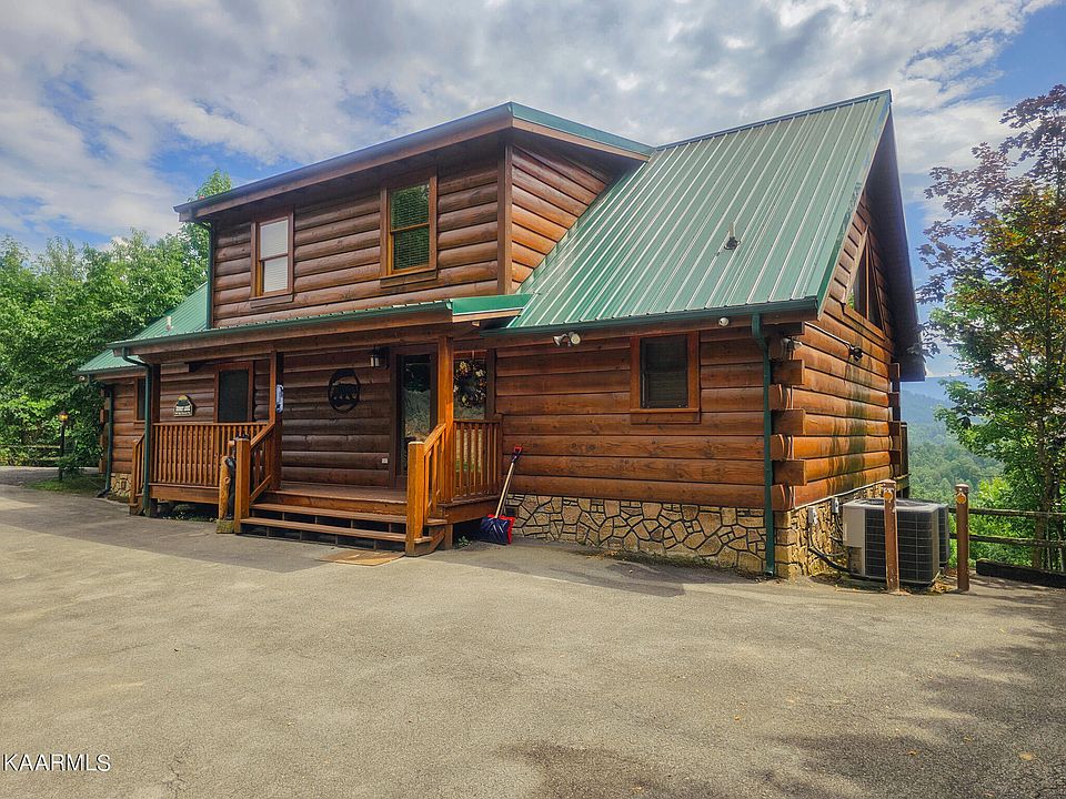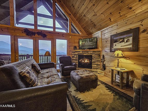 Experience the tranquil grandeur of the Smoky Mountains with this extraordinary log cabin, nestled within the prestigious Black Bear Falls community. Boasting breathtaking views of Mt. LeConte, the cabin seamlessly blends peaceful solitude and easy access to downtown Gatlinburg's lively attractions and the magnificent Great Smoky Mountains National Park. You are welcomed by the inviting covered front porch and the serene mountain scene etched on the glass front doors. The crown jewel of the cabin is the spacious great room, featuring a cozy gas stacked stone fireplace, warm wood flooring and dramatic floor-to-ceiling windows that offer panoramic views of magnificent Mt. LeConte. The cabin's spaciousness unfolds with five generous master suites, each complemented with en suite bathrooms. The kitchen, adorned with polished granite counters and a handy breakfast bar, is fully equipped for all your culinary adventures. For entertainment, a basement rec room offers a media area, pool table and vintage arcade games, while the PVC vinyl plank flooring adds durability and a modern touch. Immerse yourself in outdoor living on two covered rear decks, which provide panoramic views of the Great Smoky Mountains, perfect for relaxing or entertaining. These decks also host a large hot tub and inviting rockers, creating a serene space to unwind. Fire up the gas grill and enjoy some outdoor cooking, all while soaking up those amazing mountain views.