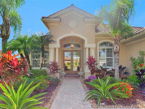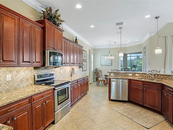 It's all about the Sunrise and Sunset views! Fantastic Southern exposure with lake & golf course views. Upgrades galore including upgraded tile on diagonal, granite counters, wood cabinetry, accordion shutters, decorator fans, in-house vacuum, custom closet shelving & custom window treatments w/crown molding! Warm & inviting, this stunningly decorated home is move-in ready. 3rd bedroom with queen bed can be converted back to use as a den. Elegant dining room easily seats 8 for dinner. Master suite offers walk-out to covered lanai, his & her walk-in closets & separate tub & walk-in shower, dual vanities & make-up vanity -Air outdoor kitchen w/additional outdoor dining bar, down lighting & granite counters. The extended pool deck w/brick pavers offers a spacious salt-water heated pool & spa. Lush landscaping, up lighting, Kenetico full-house water purification system, newer AC, Water-loving residents of the Quarry enjoy 500 acres of navigable lakes for boating. The Lake Lodge & Resort Pool, Jacuzzi, Fitness Center, Lap pool, Tennis, Bocce Ball, Pickleball, Marina & private Beach with outdoor dining. No mandatory golf membership.