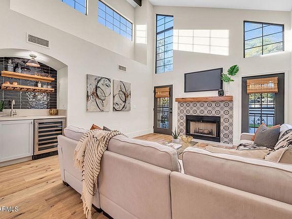 Home Sweet Home in Sweetwater Ranch! Freshly remodeled 3 bed & 2.5 bath patio home in this highly sought after neighborhood blends Southwest chic design trends with a modern yet cozy vibe. As you enter, the sky-high vaulted ceilings provide plenty of natural light throughout the living spaces and the well situated split floorplan w/dual primary suites. Downstairs you'll find a primary bedroom w/luxurious ensuite bathroom and a front bedroom (or dedicated den/office) with ensuite powder bath. The upstairs primary bedroom has full ensuite bathroom, a desk/office nook and mountain views. A gourmet kitchen boasts a GE Matte Slate appliance suite, custom range hood, quartz countertops w/waterfall edge and an eat-in kitchen. Dining space, wet bar & fireplace in the LR are great for entertaining.