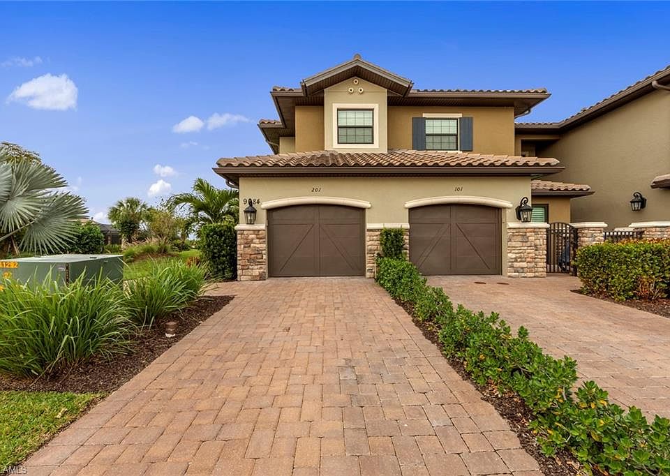 Welcome home! Desirable 2nd floor Romano coach home with FULL GOLF MEMBERSHIP included, features North-Western exposure with breathtaking sunsets, gorgeous golf & lake views! This 3 Bed/3 bath end unit offers immaculate elegance & comfortable living. The open concept floor plan, tray ceilings, fireplace, crown molding, impact windows & doors, & more than 80K high-end upgrades. Kitchen with 42" cabinets, quartz counter, GE Professional Series appliances, big pantry. Master bedroom w/en-suite offers spacious walk in closet with built in organization, dual sinks, walk-in shower & upgraded tile. Windows have custom drapery; it truly shows like a model home. The lanai features corner impact sliding glass doors. Just a few steps from the community pool. Esplanade Golf & Country Club offers a wide variety of resort style amenities: bocce, 6 tennis courts, 4 pickle ball, resort style pool/lap, cabanas w/towel service, dog park, walking trails, driving range. Other amenities include: beauty salon, spa, fitness center & aerobics room. Tiki bar & restaurant music on Friday nights! There is a sensational new culinary center with plenty of outdoor dining.