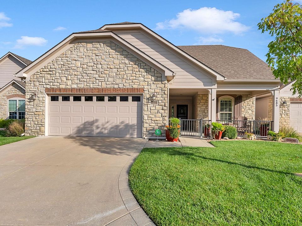 Life is elegant and simplified at 9685 W Village Place, where thoughtful design, modern finishes, and exceptional care create a truly special home. This zero-entry residence features a rare, enclosed bonus sunroom or den—perfect for relaxing, reading, or enjoying peaceful backyard views with privacy. Step outside to a covered patio and seating area, a fenced yard suitable for pets or gardening, and an expansive front porch ideal for morning coffee or evening relaxation. Inside, the home impresses with beautiful granite countertops, abundant cabinetry, and quality finishes that elevate every space. The expansive master ensuite offers a private office or sitting area, generous closet space, and a spa-like bath for comfort, while the secondary bedroom, full bath, and large laundry room add convenience and functionality. Nestled at the back of the Watercress Village development, the home offers quiet privacy while maintaining easy access to neighborhood amenities like the clubhouse, community pool, and nearby Swanson Park. It sits within the highly regarded Maize USD 266 district and provides convenient connectivity to major roads and highways such as Ridge Road, Tyler Road, 37th Street, and the K-96 corridor, facilitating straightforward access to the Wichita metro area, shopping, and dining. Residents also benefit from proximity to major hospitals, including Ascension Via Christi St. Teresa, roughly 4–5 miles away, as well as Ascension Via Christi St. Francis and Wesley Medical Center, all within approximately 8–11 miles, providing a full range of healthcare and emergency services. Complete with a storm shelter for safety, this home blends comfort, style, and peace of mind—there may be others, but this is the one.