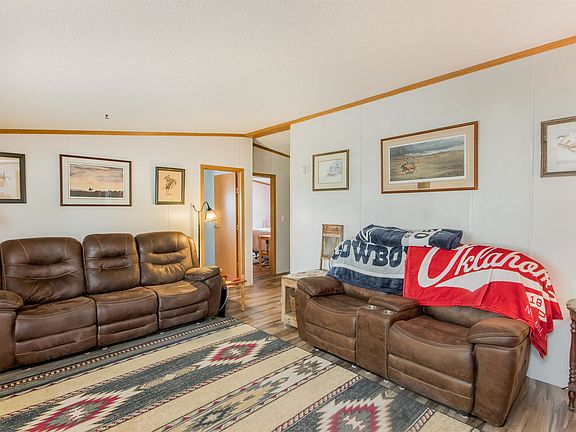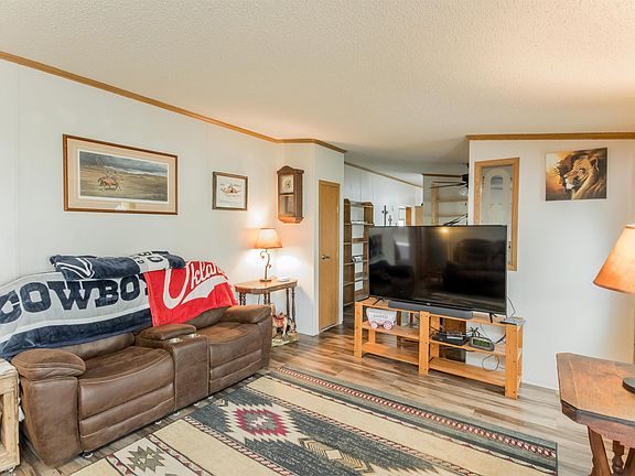 Beautiful country living in Leon! If you have a preconceived notion that double wide manufactured homes are confined, starter-home living spaces, this listing will definitely make you do a double take! Imagine owning over 3 acres in the country with a 3 bed, 2 bath, 1,716 sqft single family residence that features a home office, showcase kitchen, and spacious open front and rear decks, plus more! 9686 SE Tubby Dr has plenty to offer inside and out, so make sure to check out this listing. The unassuming bungalow has a beautifully landscaped frontage with a graveled U-driveway, a 2-slot carport, and 2-car detached garage. The front deck beckons you into a cozy and bright living room with a sectioned-off home office. At the back of the home is an expansive open-concept living space where a family room, formal dining area, and a U-shaped showcase kitchen share wonderful views of the outdoors with its multitude of large picture windows! The U-shaped kitchen features beautiful natural-stained wood cabinets, stainless steel appliances, and a movable kitchen island to provide you with an efficient and flexible working space when prepping meals. The formal dining is spacious and can easily accommodate up to 6 guests. The family room with its corner stone fireplace extends to a spacious rear open deck; a perfect option to easily entertain your family and guests whatever the weather! The home has 3 bedrooms, 2 of which share a full hall bath. The master bedroom has its own bath with a relaxing jetted corner tub. A utility room provides a discreet space to house your laundry equipment, and the attached garage offers plenty of storage and working spaces. Plenty of outdoor parking space and an extra gravel parking base for recreational vehicle parking alongside the backyard. The home has plenty of mature trees, giving it cool shade. A storm shelter gives you complete peace of mind. Recent updates to the home are the blinds, newer stainless steel appliances, vinyl laminate floors, and a negotiable washer and dryer unit. Water is rural and the septic is a fenced lagoon. The garage is heated and has a large air compressor. If you require extra storage, the home comes with a metal garden shed. Live in a beautiful town where you can easily relax in the country amidst nice neighbors. The commute to work or to replenish supplies is a very quick drive. Don’t miss out on this chance to live a relaxing life in the countryside. Call us today to schedule a private showing.