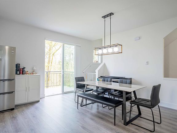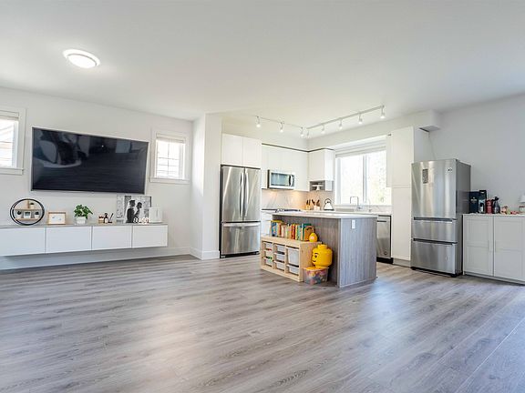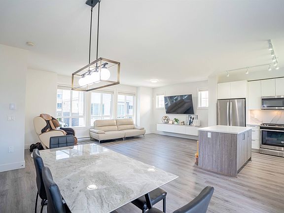 BEST PRICE & LOCATION IN COMPLEX! This 3-bed, 2.5-bath corner townhome by Streetside Developments backs onto a serene greenbelt. The Canopy model boasts an open-concept layout with a modern kitchen featuring Whirlpool stainless steel appliances, gas range, and quartz countertops. . A double garage ensures ample storage. Steps from schools, Tynehead Park, T&T, Guildford Mall, and major routes, this pet- and rental-friendly gem shines. Main floor features airy windows, warm laminate flooring, a powder room, and a balcony with gas BBQ hookup. Upstairs, find a stunning ensuite and full bath with deep tub. Private, fenced backyard! A cozy treasure!