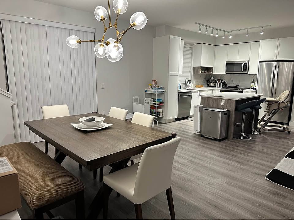 This modern 1528 sq feet, 3-bedroom, 2.5-bathroom townhouse combines the serenity of living by a forest with the convenience of being minutes away from Highway 1. It features an open concept main floor with gourmet kitchen, stainless steel Whirlpool appliances, a gas range and quartz countertops. The home also has a custom built show-stopper entertainment unit with plenty of storage. A private mini-deck in the back is perfect for enjoying a BBQ or some drinks. Upstairs, the primary suite boasts vaulted ceilings, a walk-in closet, and a spa-inspired ensuite, with two additional bedrooms and another bathroom. A double side-by-side garage offers ample storage. Easy access to schools, Tynehead Park, T&T Supermarket, Guildford Town Centre, and major routes. - One year lease minimum - Reference check, employment check and credit check required - Half month rent required upon signing lease - Tenant insurance and utility accounts must be ready upon move in - Unit will be unfurnished - Water is included in rent but not gas and electricity - Pets may be allowed, pending landlord approval Renter is responsible for tenant insurance and utilities. No smoking of any kind on property. Pets may be allowed pending landlord approval.
