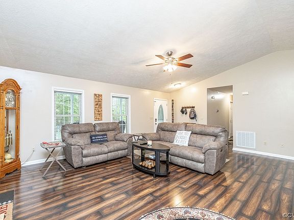 Beautiful Move In Ready Rancher! This 3 bed 2 bath home sits on 6+ scenic acres and invites you to enjoy the peace and serenity of country living w/close proximity to I-64 for convenient commuting options! Step from the cozy country-style front porch through the front door and you are greeted by a bright, airy living room complete w/handsome laminate flooring, vaulted ceilings and gas fireplace. The kitchen offers stainless steel appliances, an eat-in dining area perfect for family mealtime as well as convenient access to the deck and backyard. Proceed to the bedrooms where you will find the generously sized, fully carpeted primary bedroom and ensuite bath w/double vanities (no fighting over the sink!) and tub/shower combo. The 2 additional bedrooms offer even more space and would be perfect for a home office or playroom. Venture outside to soak up some fresh air and take in the scenery in your spacious/private fenced backyard where you can enjoy summer evenings entertaining friends on the deck or roasting marshmallows by the fire while the kids host tea parties and share ghost stories in the treehouse! Not to mention a huge 2 car garage! Come see all that this home has to offer!