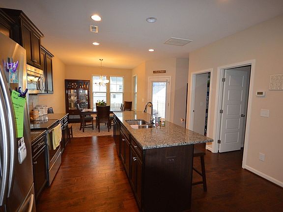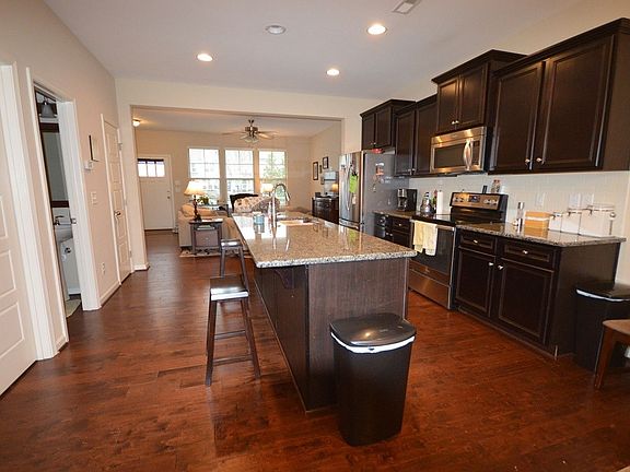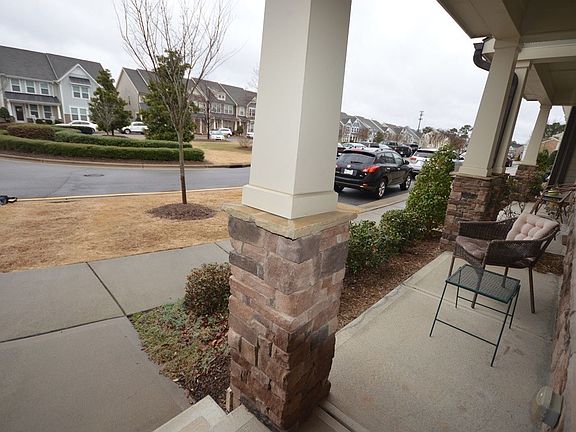 Covered, rocking chair front porch. All hardwood main floor. Open floor plan. Walk through kitchen with granite counters, stainless appliances, large island, and pantry. Loft/office area second floor. Master bedrooms with walk-in-closet and full bath on second and third floors. Washer and dryer included. Fenced yard and parking spots behind home. Storage space with on-demand water heater. Landscaping included. Partially covered patio and storage room. Community pool and gym access.