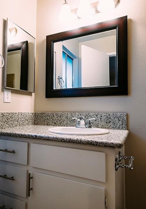 This home shines from the minute you drive up to see the new exterior paint and newly sodded grass. A blue front door leads you into the foyer and into the living room with white brick fireplace, gray/brown laminate flooring that reminds you of a beach home, custom two tone tan walls and large windows. All new window coverings in 2"faux woods will be added. The kitchen with its popular white cabinets, same laminate flooring, new stove and shiny faucet will make it a joy to cook. There is new carpet in all the bedrooms, the two bathrooms are nicely remodeled with granite style counters and gray custom flooring. Be the first to see this nice home. Presented by SAN MAR Properties BRE#01215986 . One approved small pet welcome with increased deposit.