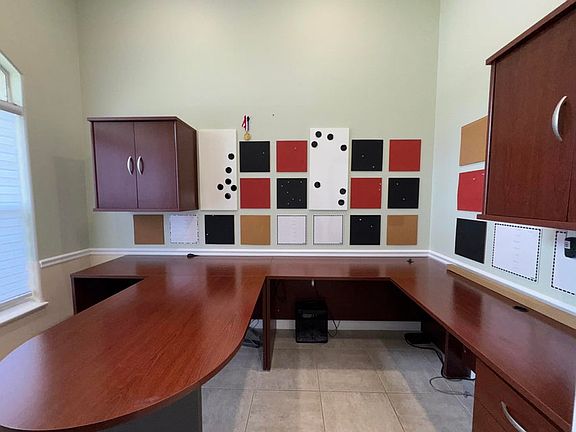 The primary suite offers direct access to a sunlit den, perfect for a reading nook, home gym, or private retreat. The office/den is currently outfitted with custom built-in desks, which the owner is happy to remove upon request. Two additional bedrooms on the opposite side of the home provide privacy for family or guests.