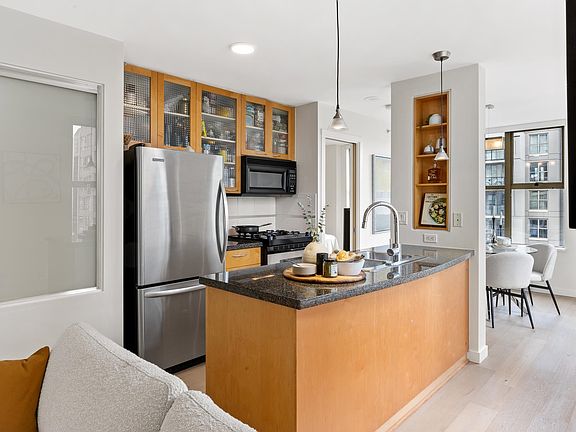 Bright and spacious corner one bedroom + den unit. High floor, functional floor plan, lots of storage, plus 2! storage lockers and a parking spot on P1. Pets and rentals allowed (1 pet, no size restrictions. Rentals allowed at 100%, min 1 month). Built by Bosa and offers incredible amenities with a large gym, hot tub, steam room, guest suite, and a party room. If you want to be in the center of it all - you've just found what you were looking for! Steps to Yaletown restaurants, shopping, seawall and all Richards street living has to offer.