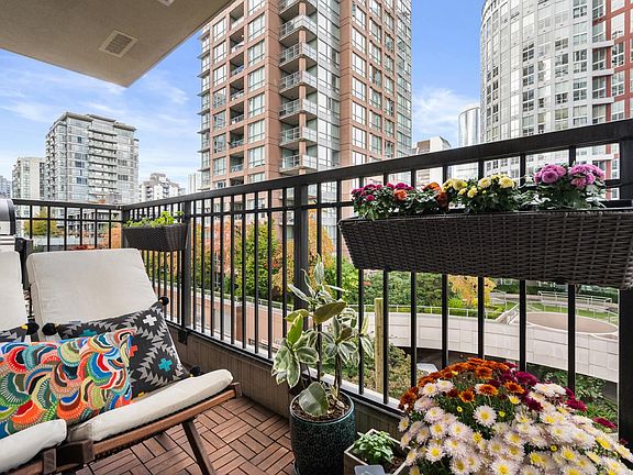 Perfect studio suite at Mondrian 2! This one is unique because of its great outdoor space with a very pleasant outlook...a very large 5' x 16' balcony which basically adds an extra 83 sqft outdoor living room to this already great home. Super efficient layout offers you a full kitchen with gas stove & stainless steel island, comfortable living room with cozy gas fireplace, maple hardwood floors, clever sleeping area with fold-down Murphy bed & built-in cabinetry plus a den for a home office. Also comes with a secure storage locker. The Mondrian is a very solid & well respected Bosa built building featuring a guest suite, exercise room, steam room, hot tub & games room all within walking distance of everything you could need. One pet & rentals welcome.