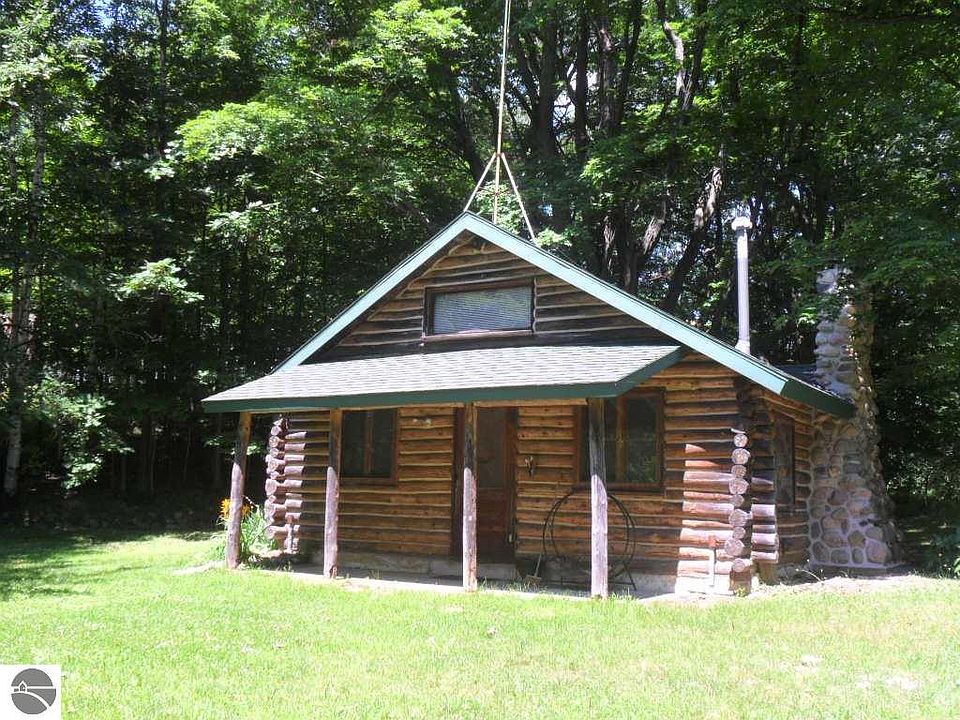 Cute 1 bedroom full log home with fireplace and shed, sits on 6 wooded acres.
