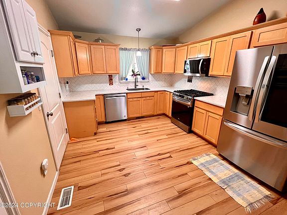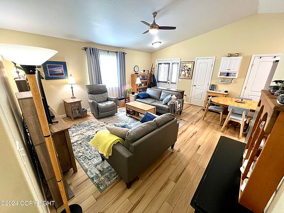 Many upgrades in last 2 yrs: Quartz countertops, tile backsplash, new microwave, gas oven, dishwasher, large paved driveway, custom deck with framed roof, privacy fence, and shed. Vaulted ceiling, vinyl plank flooring in kitchen, entry, & hall. Primary bedroom ensuite bathroom, accent lighting, WIC, sliding door to new private deck. Located 12 miles from Skeetawk ski slope in Hatchers pass.