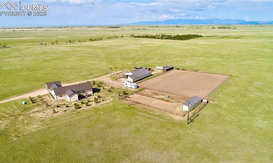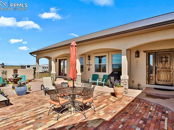 RANCHO SANTA MARGARITA is a 40 Acre Horse Property with STUNNING Mountain Views & Premier Equestrian Facilities. If you're searching for a true Colorado lifestyle, where wide-open spaces meet luxury living, this Spanish-inspired ranch style home on 40 acres is your dream come true. Set against the backdrop of Pikes Peak, the Sangre de Cristo Range, and the Spanish Peaks, this property offers privacy, serenity, and stunning views, all while being conveniently close to town. The 3-bedroom, 3-bath home blends rustic charm with modern comfort, featuring wood and travertine flooring, soaring 9+ foot ceilings, two cozy fireplaces barreled ceilings, and much more. The kitchen boasts granite countertops, eat-in bar, custom cabinets, stainless appliances and custom finishes, making it perfect for entertaining after a day of riding or working on the ranch. Designed for indoor-outdoor living, the home includes a large courtyard at the entrance and a patio at the back of the home; ideal for soaking in Colorado’s breathtaking sunrises and sunsets. For the horse enthusiasts, this property is turnkey — offering a custom barn with five European stalls with runs, heated waterers, a wash rack, and a heated tack room with a full bathroom. Tack room can possibly be converted to additional living quarters/bunkhouse. Additional equestrian amenities include loafing sheds, pipe pens, a riding arena, and expansive pastures. The well allows for watering of the home, livestock, & irrigation of lawn & garden. The spacious shop (with room for parking) and equipment shed provide ample space for trucks and gear—whether you're running a horse operation, working on projects, or simply enjoying country life. This is more than a home—it’s a way of life. Whether you're riding at sunrise, watching the stars over the mountains, or simply embracing the peace of wide-open spaces, this 40-acre Colorado ranch is the perfect place to call home! Additional 35 acres & water rights available.