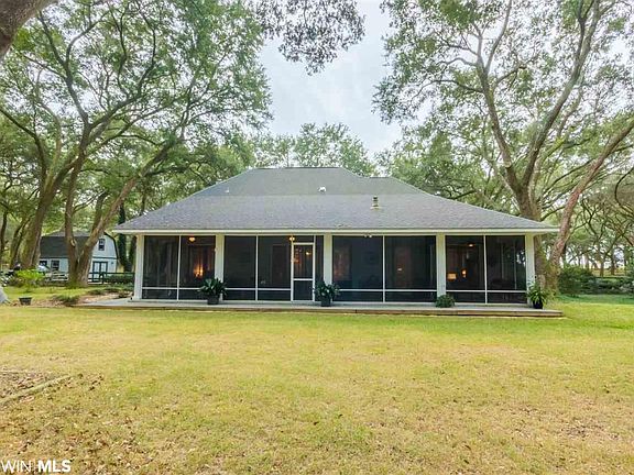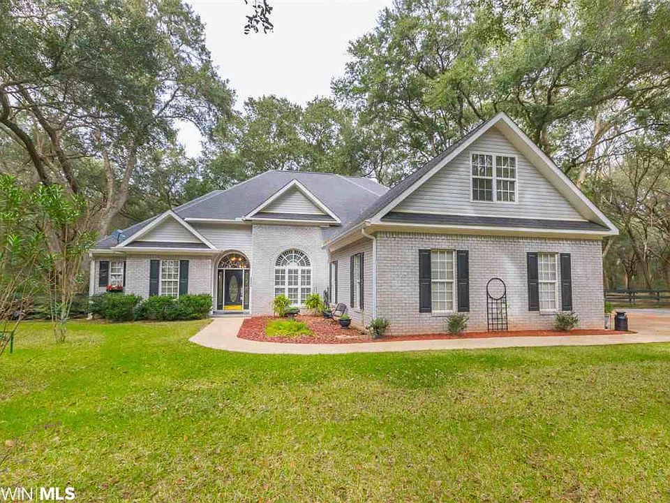 Custom built estate home on 5 acres of live oak trees close to Magnolia Springs located on a private drive. The kitchen has oak cabinets, granite counter tops with high end appliances. A breakfast area is attached to the kitchen with a built in Oak buffet and 8'french doors leading to a covered porch with ceiling fans. The Dining room has plantation shutters with 14' ceiling and crown molding. The front door, with separate foyer, has leaded glass and leads to the Living room which 12'ceilings and a gas fireplace. The Master suite has an attached screen porch with 8' french doors. The Master bath has an oversized custom Bain air jet tub with heated back rest. The Master closet is oversized with built-ins and a window with window seat for additional lighting and a ceiling fan. All interior doors are 8' and windows are floor to ceiling for additional lighting. There are 3 sets of French doors off the back of the house looking at the magnificent oak trees. The Kitchen, Living room, Dining room and halls have oak hardwood floors. All rooms have ceiling fans and lights with recessed lighting in all major areas. Tile flooring in all wet areas and carpet in the bedrooms.There is also a large separate laundryroom. The second floor has a large media room, full bath, and bedroom. There is also a large attic for additional storage. The garage is oversized with 2 overhead doors and one outside door for easy access to the driveway. It also has a half bath with utility sink. Outside is a large 16'x16' two story barn. This is a must see home. Great for entertaining and family living. This is country living at its finest but close to shopping and the beaches. It is also a great location for horses. This house is ready to move in today.