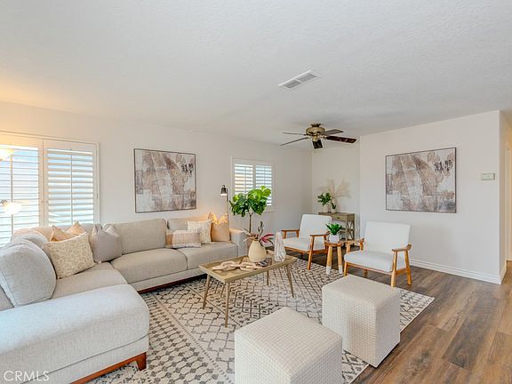 The living room features plantation shutters and seamlessly flows into the dining area, which includes sliding doors leading to the backyard. The dining area also connects to the kitchen, creating an ideal layout for entertaining. The kitchen, thoughtfully remodeled, offers ample counter space, abundant cabinetry, a charming farmhouse sink, and a garden window overlooking the front yard.