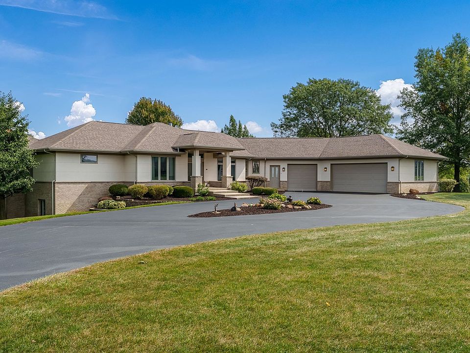 The dream home you've been waiting for is now here! Custom built by the Builder, Nick Rankus, as his own home in 2000, this masterpiece was built to perfection! Tucked away on a quiet cul-de-sac in Boone County, this fully exposed ranch-style home is located in desirable Timber Creek Estates. The first impression is the expansive circular drive, a dramatic front porch & double glass front doors that lead to a charming, contained foyer that opens to the great room via French Doors. This home boasts gorgeous views of the private 3.38 acres of lush lawns & woods. Offering soaring ceilings, walls of windows, upgraded trim & moldings, built-ins, heated flooring at the lower level & the majority of the home has been recently painted. The great room offers a spacious room for entertaining & features a brick gas fireplace, built-ins, & walls of windows. The formal dining room is ideal for your holiday dinners. The large chef's kitchen has a center island, workstation, all Wolf brand appliances, double ovens, granite countertops, pull-out cabinetry, pantry & access to the deck. There is also a large laundry room with tons of cabinets, workspace, closet & powder room on that side of the house. The primary bedroom & bath plus a guest room are on the other wing of the house. The primary bedroom offers additional living space ideal for an office or lounging area. The bath offers a jetted tub, separate tiled shower, built-in linen closet, double sinks in vanity with granite countertop. The walk-in closet is large & offers great storage space as well as a built-in ironing board. The full walk-out lower level is identical in appointments as the upstairs living space. There is a family room with fireplace & patio door access to the yard, two spacious guest bedrooms, guest bath & a third room currently used as an office/sewing room that has its own private access doors to the rear yard. The unfinished spaces feature two storage areas; one storage area has the mechanicals, storage shelving and a room which could easily become a wine cellar & the second storage area has partial exposure & currently housing gym equipment & has access to the garage via a staircase. The 4 car garage also has a work area. The garage floor has been epoxied & there are two service doors to either the front or rear yard. There is an inground sprinkler system, central vac, security system & active radon mitigation system. The roof & the Furnace/AC are 5 years old. This home is a WOW!