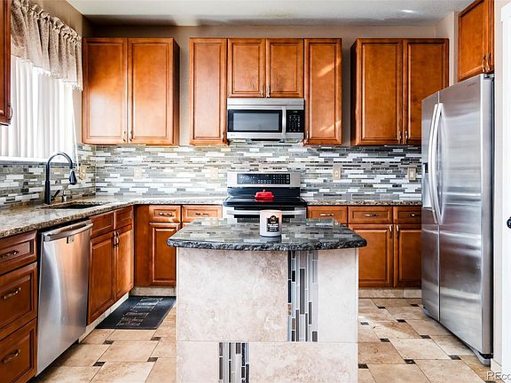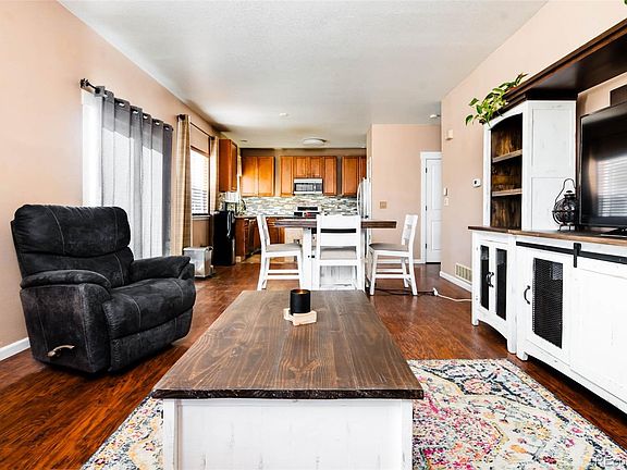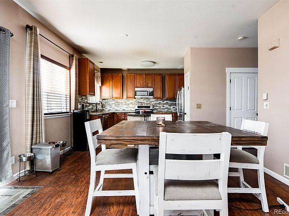 Nestled in the alluring neighborhood of Eagle Creek, this beautiful 4-bedroom, 3-bathroom home offers a fabulous layout that flows seamlessly for both entertaining and living. At the heart of it all, an open-concept kitchen, living and dining space is trimmed with an abundance of windows letting in plentiful natural light, while handsome hardwoods travel throughout. In addition to ample cabinets, stainless steel appliances, two-toned granite countertops and striking backsplash, the well-appointed kitchen boasts heated floors, a pantry closet, and coveted center island. A bonus room near the entry is perfectly suited for a formal dining space, home-office, or play room. As an added convenience, a spacious and stunning ¾-bathroom completes the main level. On the upper floor, all four bedrooms are oversized with large windows, ceiling fans, and generous closet space. The fantastic primary retreat unfolds into an ensuite full-bathroom featuring double sinks and shower-tub combo with decorative tile surround. An extra closet, linen closet, and additional full bathroom all line the upstairs hallway. Downstairs, an unfinished basement composed of laundry hookups, egress windows and unlimited potential provides opportunity for a fitness room, media room, or any desired integration of added living space. The incredible backyard is accentuated by a spacious patio and large pergola for relaxing or dining al fresco. Finally, a terrific 2-car attached garage includes a 220 volt outlet as well as built-in storage space. Recent updates include new HVAC (2020), water heater (2020), and newer roof (2019). Residents of Eagle Creek can enjoy close proximity to grocery stores, shopping, restaurants, parks, scenic trails and Rocky Mountain Arsenal Wildlife Preserve; plus, easy access to several major highways for a quick commute to downtown or Denver International Airport (DIA).