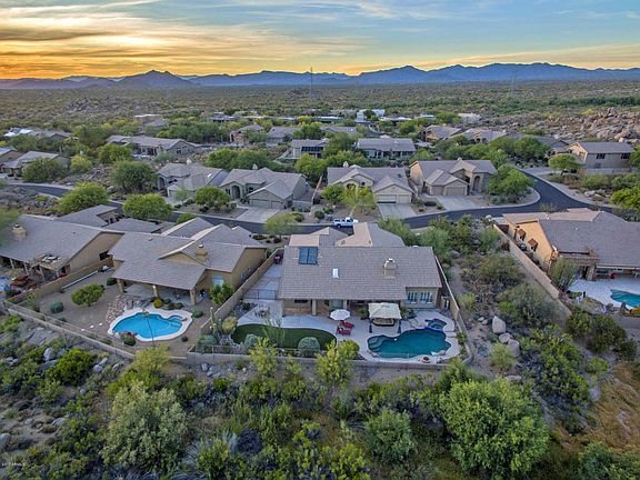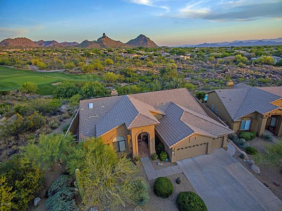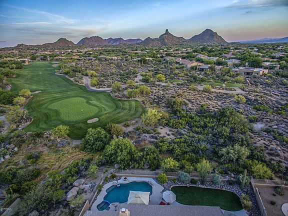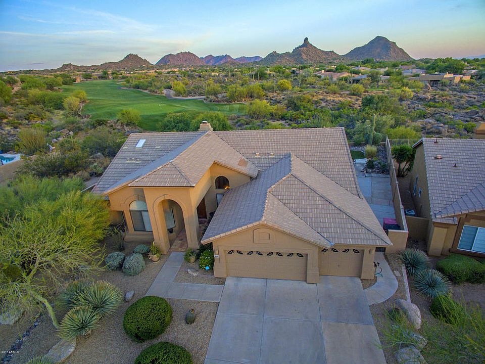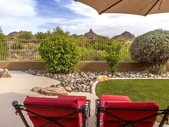 Captivating Views of Pinnacle Peak Mountain are yours in this Beautifully updated home in Troon North. Very private backyard with pebble-tec heated pool and spa backs to the 4th hole on the Monument golf course in Troon North and NAOS w/lemon and lime trees.Great room floor plan, 3 bedrooms plus an office, recently remodeled and upgraded Kitchen with double ovens and a Thermidor Steam oven. Highly upgraded master bath has a double size jacuzzi tub for two. Solar 120-gallon water heater. Nest Thermostats. Surround sound in master bedroom and living room. 3 car garage with Built-in cabinets.
